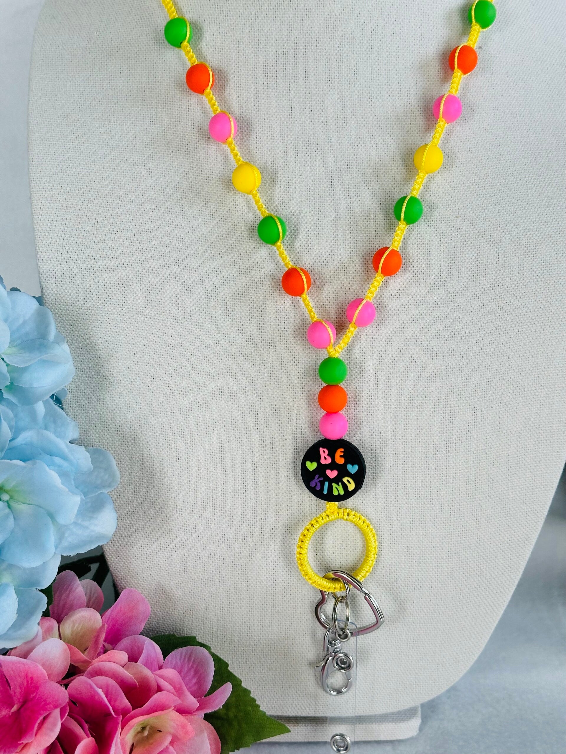 Porta credenciales y llaves, hecho con hilo nylon amarillo y perlas de silicona de 9mm.