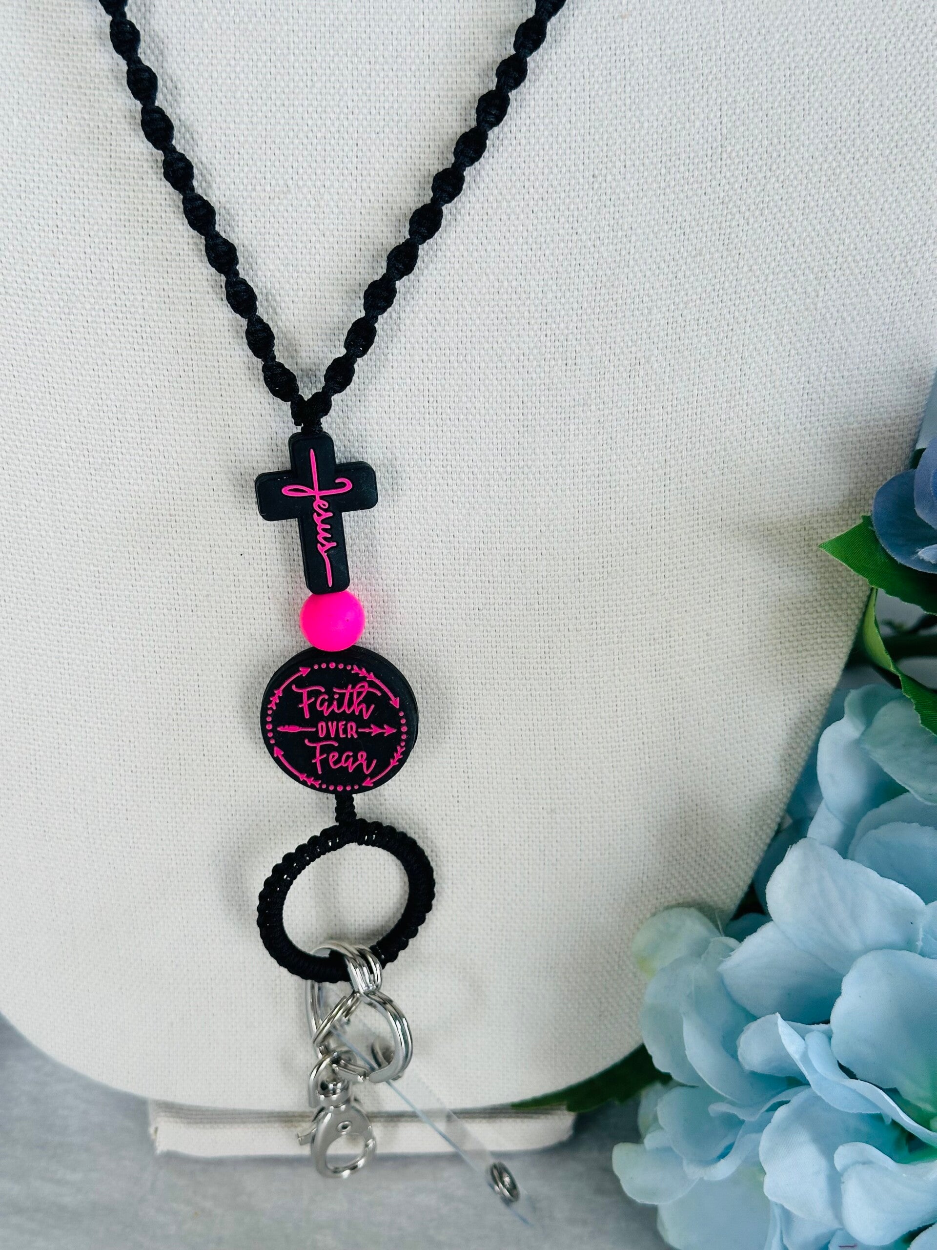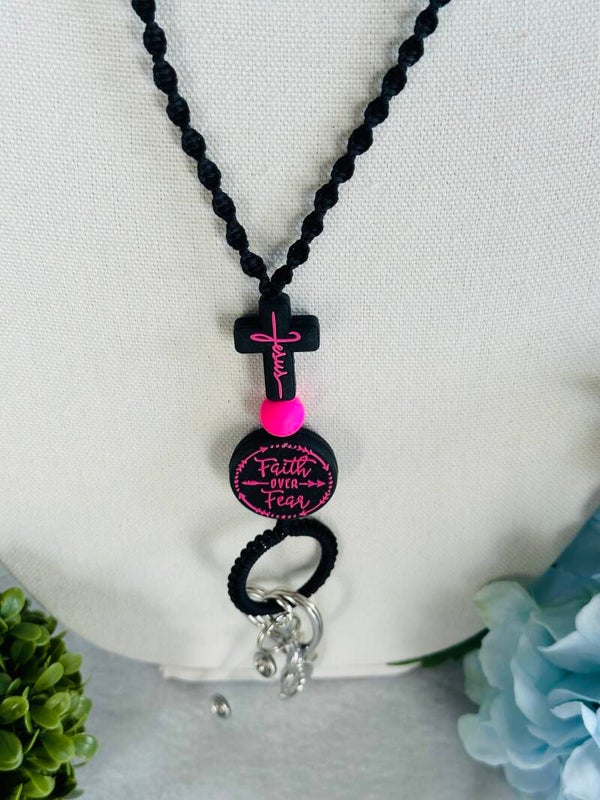 Porta credenciales y llaves, hecho de hilo nylon color negro y cuentas suaves negras y rosa.