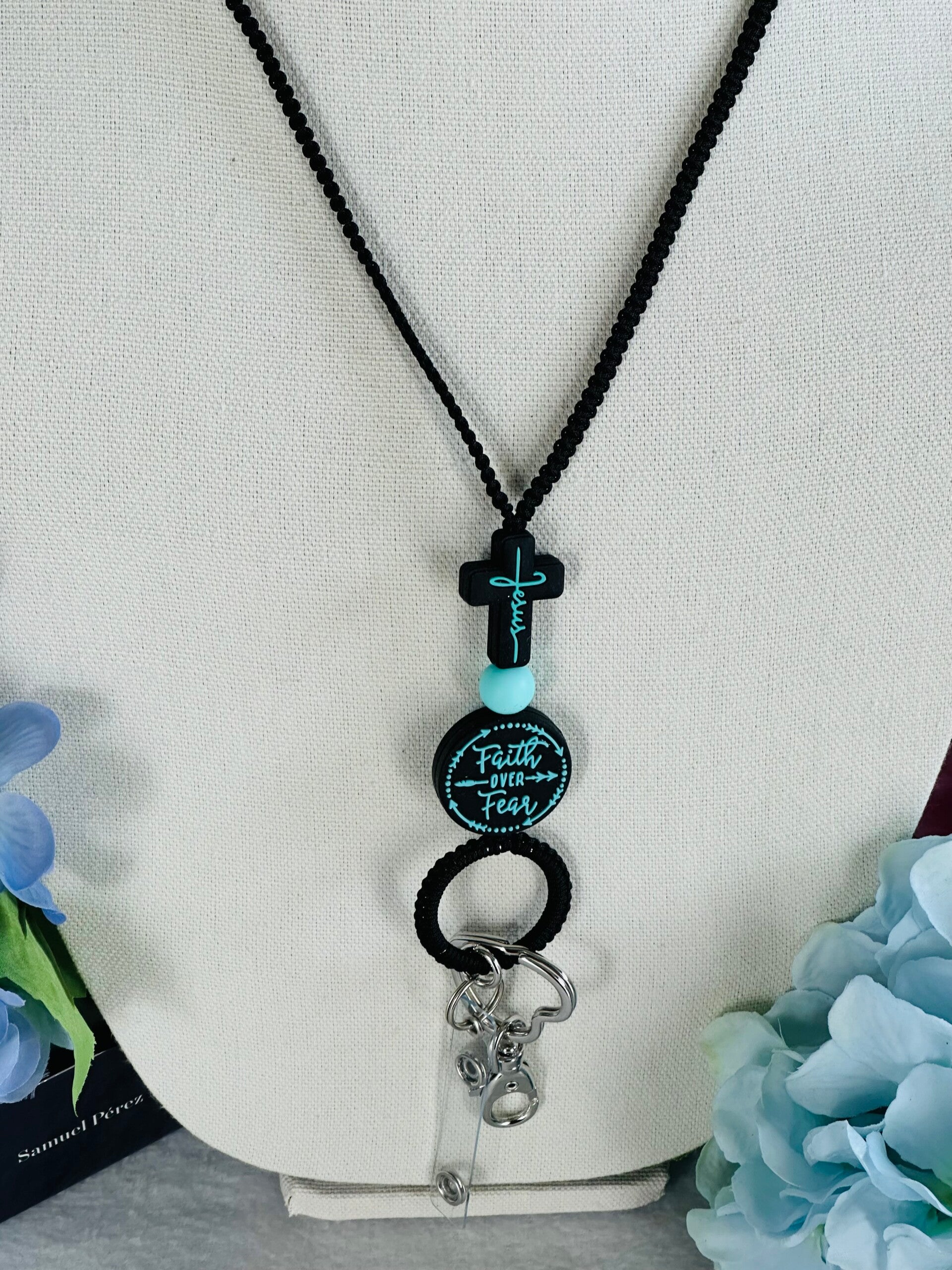 Porta credenciales y llaves, hecho de hilo nylon y cuentas suaves de silicona negro y verde azulado.
