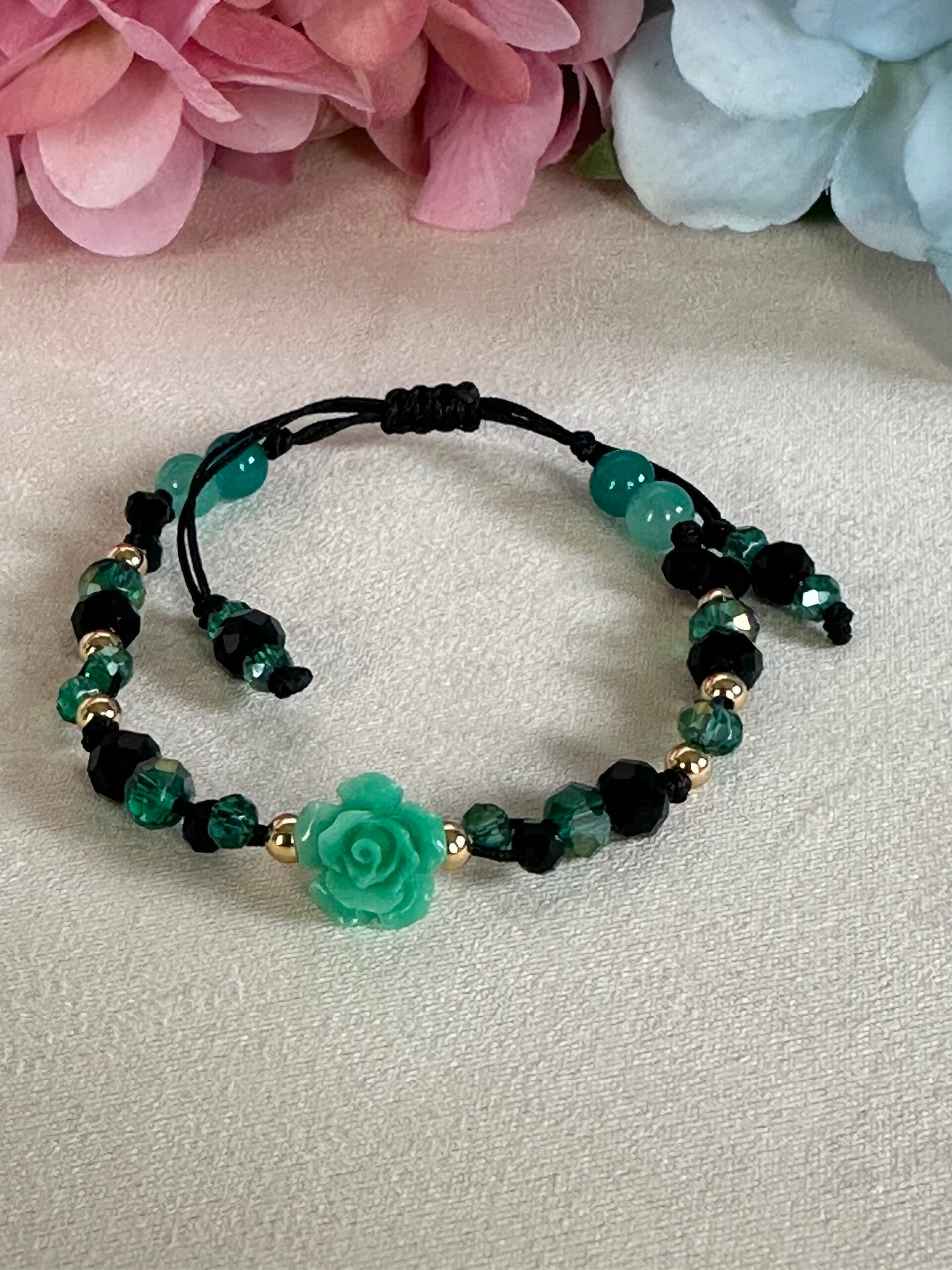 Hilo nylon, cuentas de cristal verde y negro con balines color oro