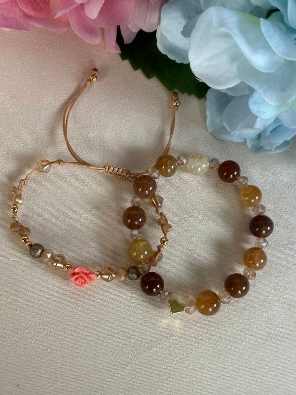 Pulsera elástica color crema y marrón con corazón en oro